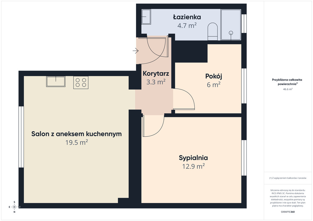 - salonu z aneksem kuchennym o powierzchni ok. 19,54 m2