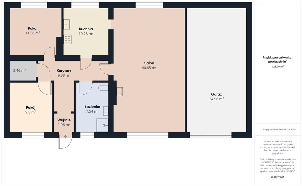 W bryle budynku znajduje się garaż jednostanowiskowy o powierzchni ok. 34,34 m2.