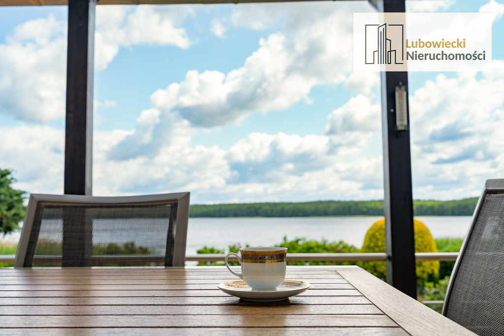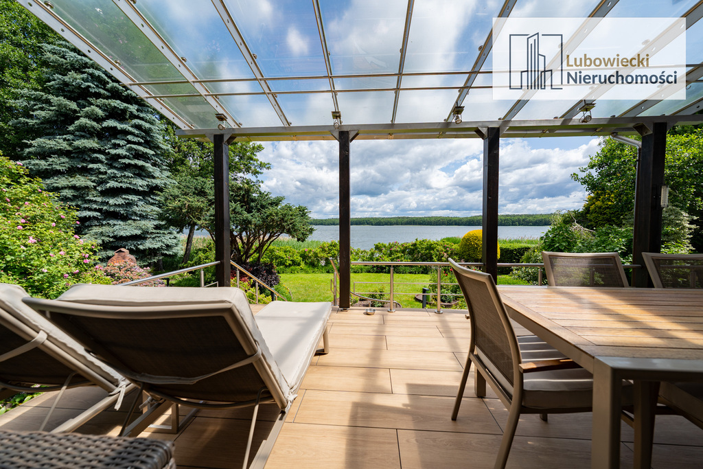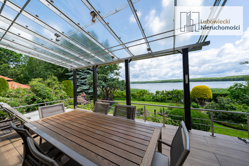 W salonie znajduje się wyjście na zadaszony taras o powierzchni ok. 25 m2 z przepięknym widokiem na jezioro, z dużym zestawem wypoczynkowym. Schody tarasowe zostały wykonane z drewna egzotycznego zebrano oraz zostały zaimpregnowane profesjonalną żywicą jachtową z warstwą końcową werniks. Pod tarasem znajduję się schowek do przechowywania sprzętów ogrodowych.