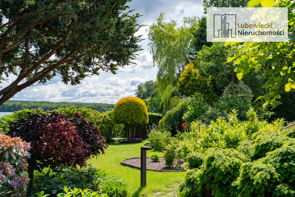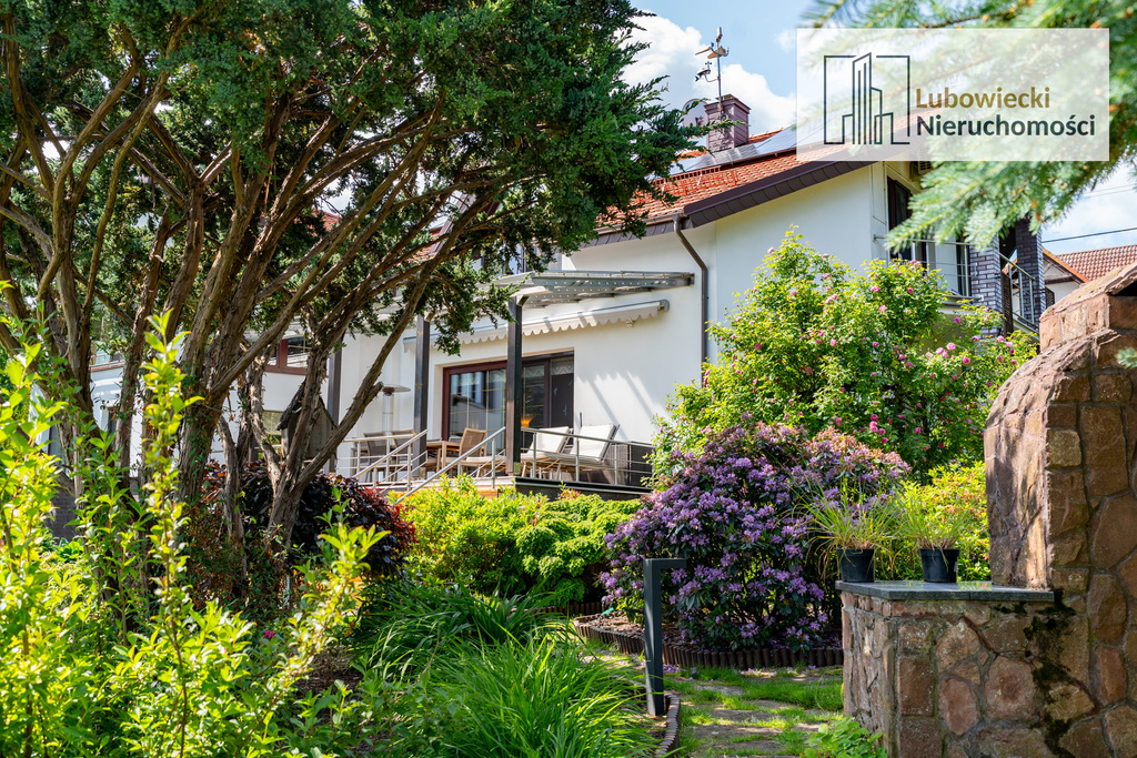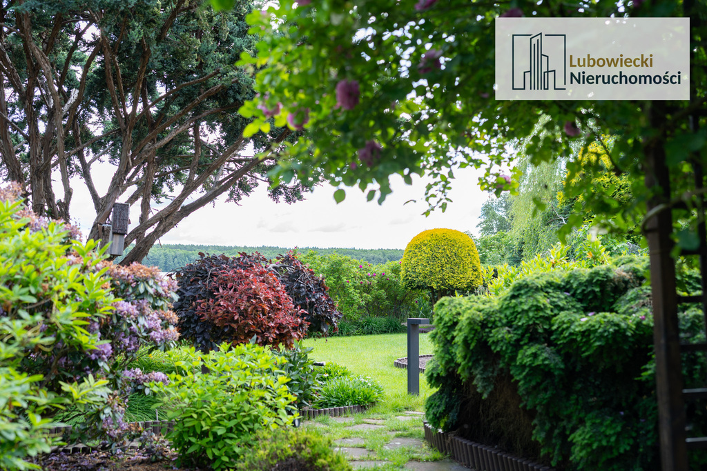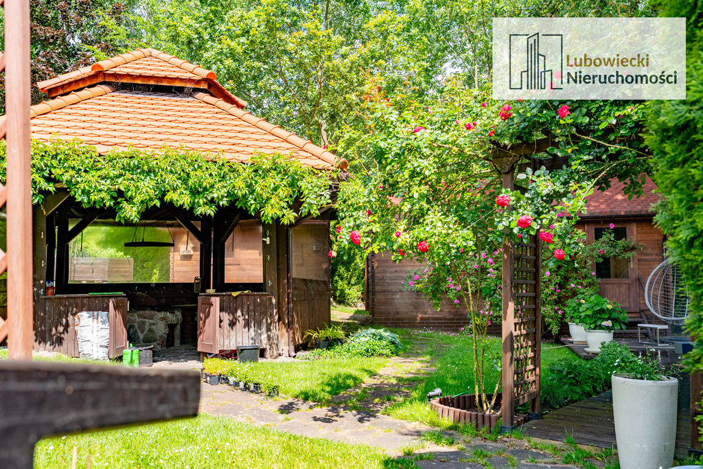 Ogród został w pełni zagospodarowany. Na terenie ogrodu zostały wydzielone oświetlone ścieżki. Przez teren nieruchomości płynie naturalny strumyk mający źródło na terenie działki zaaranżowany jako ogródek skalny z wiszącym mostkiem nad strumieniem.