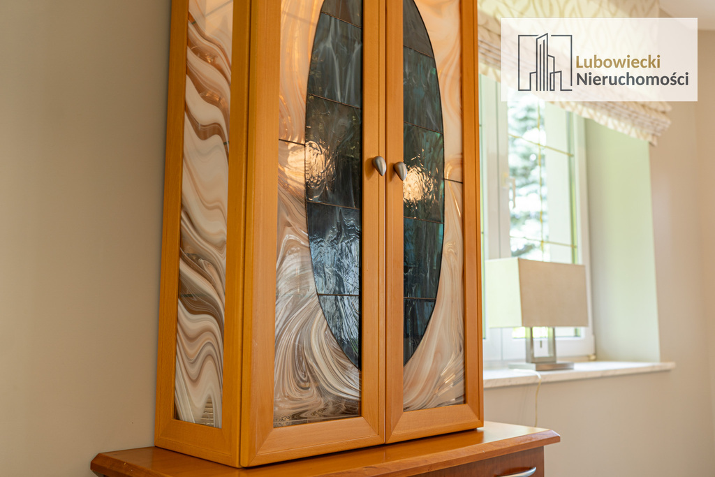 - renowację mebli w jadalni, serwantki wykonane zostały na zamówienie z czereśni amerykańskiej i buku, witraże w serwantkach wykonane zostały ręcznie,