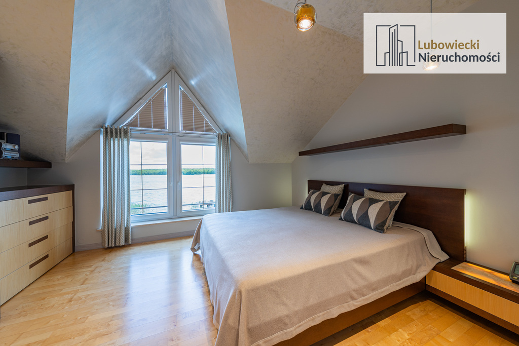 Podłoga w sypialni z widokiem na jezioro została wykonana z drewnianej deski biały klon, a meble zostały wykonane z forniru wenge oraz klonu sprowadzanego z Niemiec.