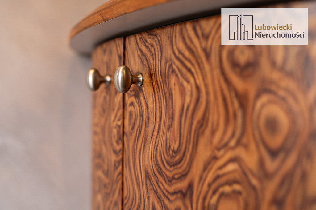 Meble w korytarzach wykonane zostały na indywidualne zamówienie – z forniru z czereśni amerykańskiej naturalnej oraz okleiny z drewna egzotycznego tzw. fornir artystyczny o unikalnym usłojeniu, według autorskich projektów.